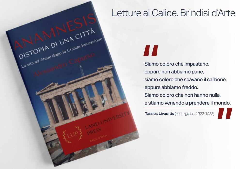 Letture al Calice, rassegna culturale che unisce arte, letteratura e valorizzazione dei prodotti del territorio, prosegue il suo percorso dopo il successo dei primi appuntamenti dedicati a libri e vini con il format “Parole, sorsi e copertine”. La Puglia, con la sua ricchezza culturale e paesaggistica, è stata al centro di ciascuno di questi incontri, e sarà nuovamente protagonista domenica 20 ottobre 2024 con l’evento “Brindisi d’Arte”, che si terrà presso _pianodue a Conversano, in provincia di Bari.
