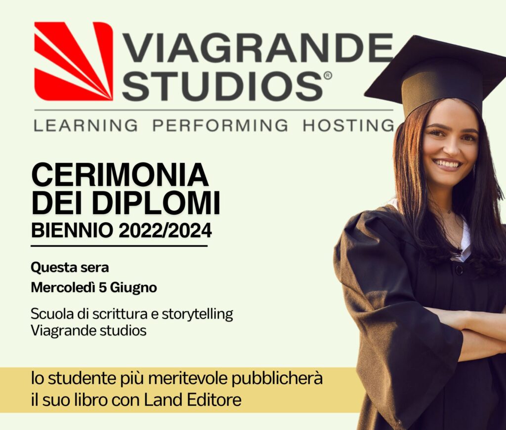 Siamo lieti di invitarvi alla cerimonia di diploma del biennio 2022-’24 della Scuola di Scrittura e Storytelling di Viagrande Studios, che si terrà questa sera presso il Teatro 106 di Viagrande Studios. L’evento sarà una celebrazione del talento e della creatività dei nostri diplomandi.