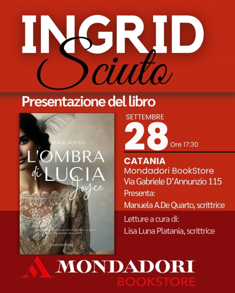 Il 28 settembre alle ore 17:30, presso il Mondadori Bookstore di Catania in Via Gabriele D’Annunzio 115, si terrà la presentazione del libro L’ombra di Lucia Joyce di Ingrid Sciuto.