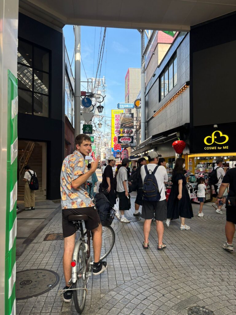 Nell’ultima giornata trascorsa a Osaka, ho deciso di separarmi dal gruppo per dedicarmi a un piccolo desiderio personale: affittare una bicicletta e perdermi tra i quartieri della città. Niente di pianificato, solo la voglia di esplorare senza meta. Mi imbatto così in un piccolo chiosco di noleggio bici e mi avvicino.