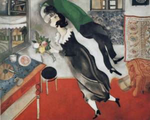 Voglio raccontarvi di un amore immenso, onirico, fiabesco, ovvero quello tra Bella Rosenfeld e il pittore bielorusso Chagall. Nelle maggiori opere dell’artista vediamo la giovane Bella raffigurata; l’immagine predominante è di loro due insieme, in volo. Qual è il più grande significato del volo se non la libertà? L’abbandonarsi insieme all’amore, sostenendo l’uno il peso dell’altra. Una storia d’amore meravigliosa, che ancora oggi possiamo ammirare nei quadri dell’artista.